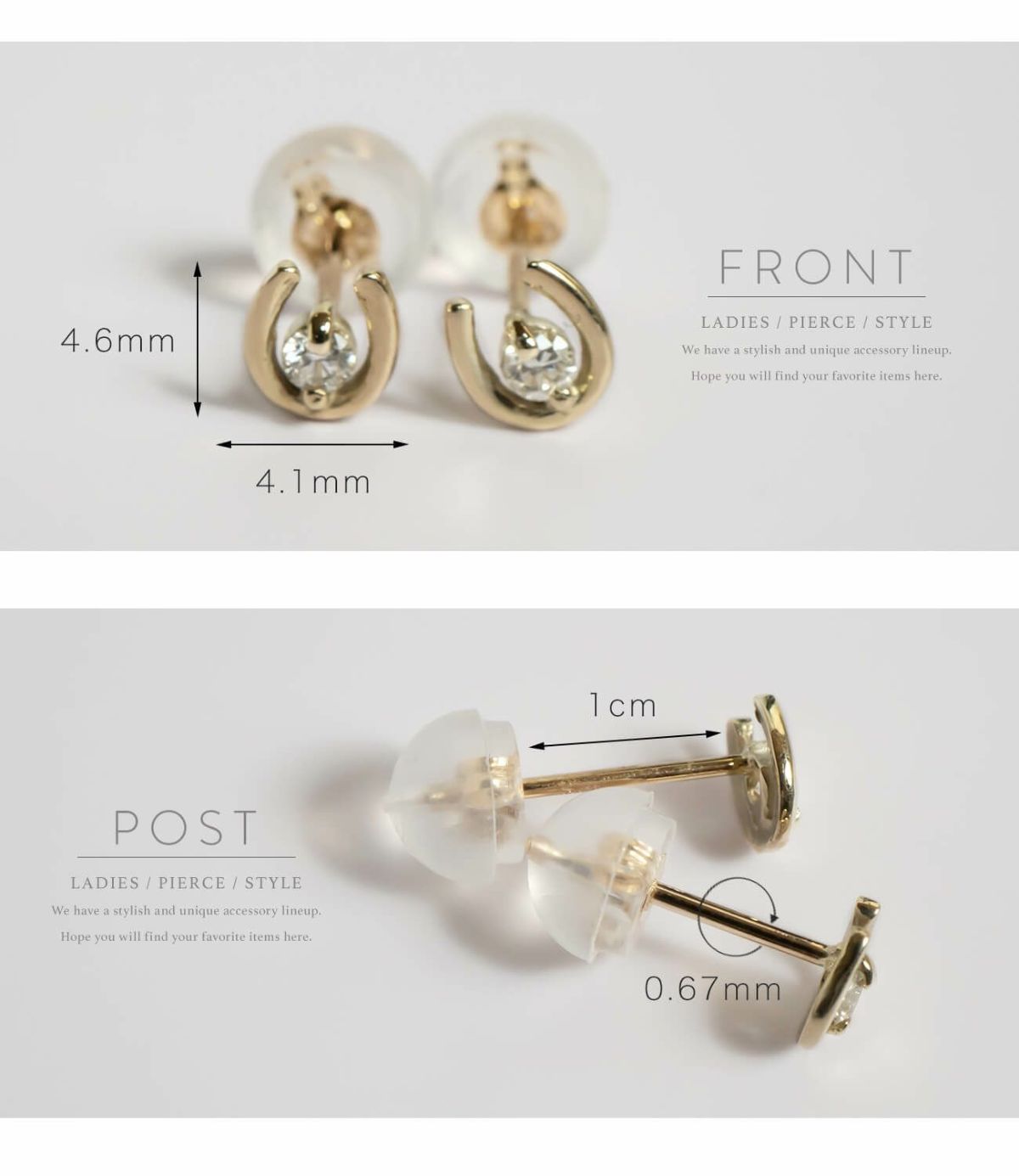 | サイズ(約) | 縦4.6mm x 横4.1mm ポスト長さ:1cm ポスト太さ:0.67mm |