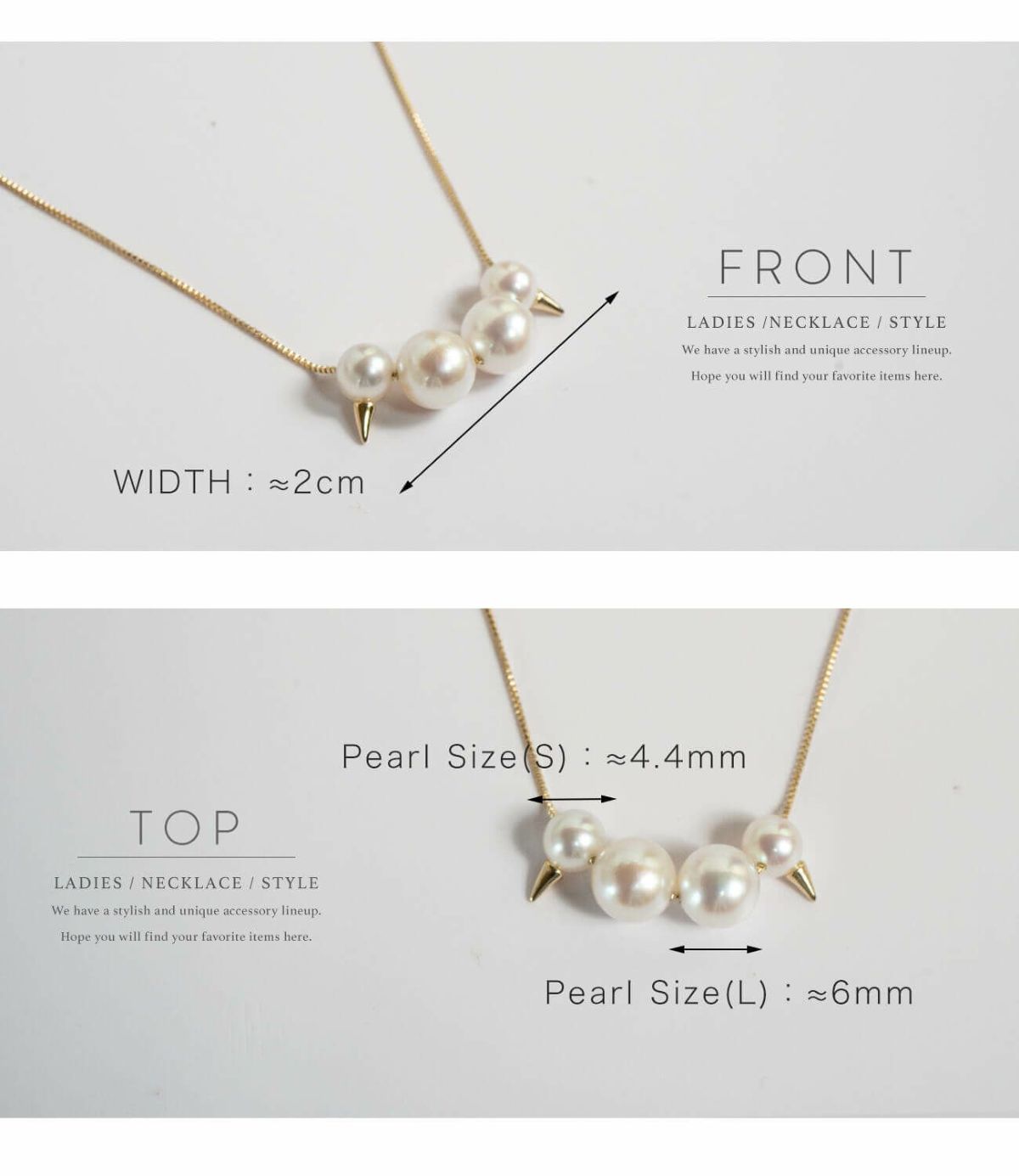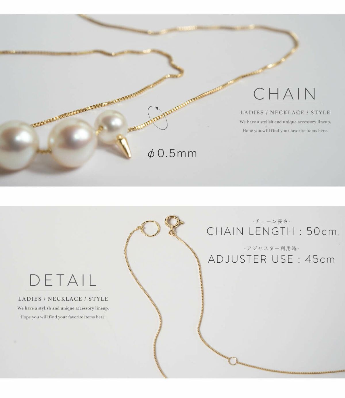 | サイズ | チェーンサイズ 50cm (アジャスターで45cm) チェーン太さ:約0.5mm パール(小):約4.4mm パール(大):約6mm |